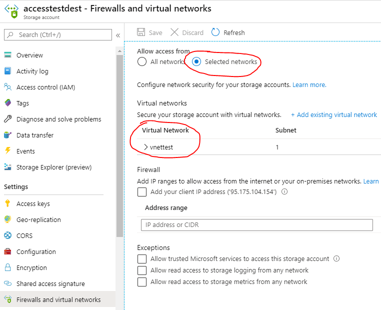 Scenario is to copy a file from accestestsrc to accesstestdest. Source blob is public but destination is secured using VNET. Here’s how destination storage has been attached to a VNET so it is not accessible from everywhere: