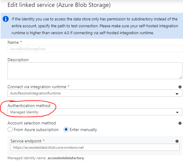 Lastly we have to change authentication method in ADF side: When we initially created connection to blob in ADF, it used account key as a method to authenticate. We must change it to use Managed identity to which we gave access rights to storage in step 1. Let’s edit linked service settings: