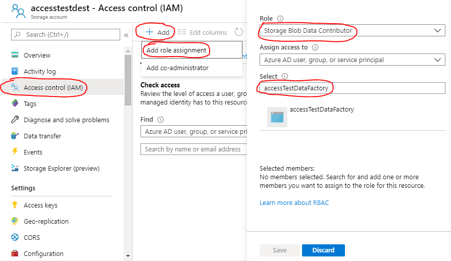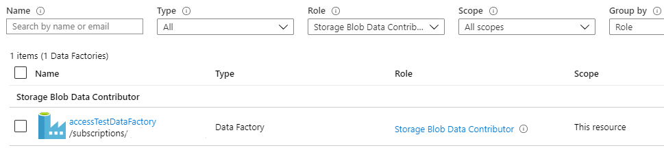 First one is done in storage account settings. Let’s select Access control (IAM) -> Add -> Add role assignment. For a Role we select ‘Storage Blob Data Contributor’ and then then name of our Data Factory (accessTestDataFactory) is written into ‘Select’ textbox. A query is done and our ADF will be listed below. Then we just select it and hit Save button.
