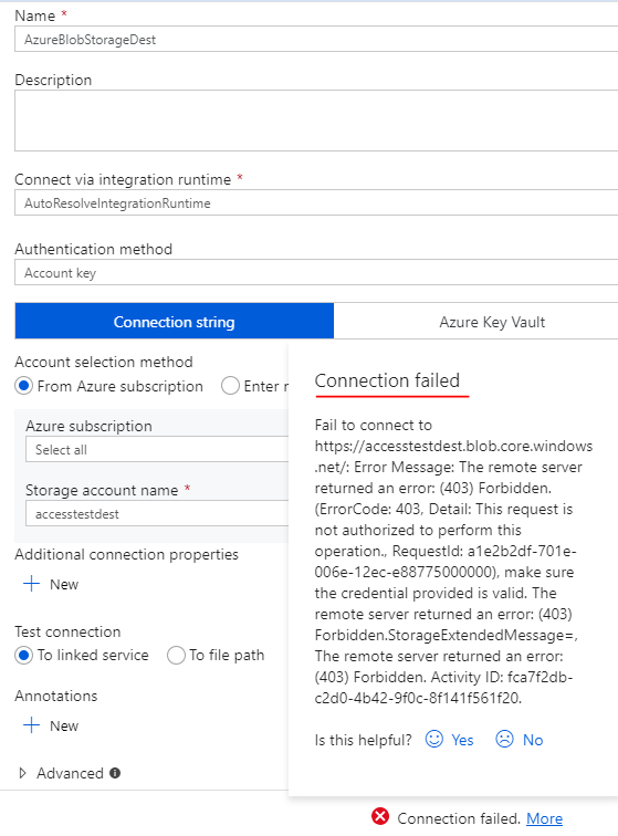 Now let’s build a pipeline in Data Factory side to copy data from source to destination. While doing this, things go south when configuring destination sink: