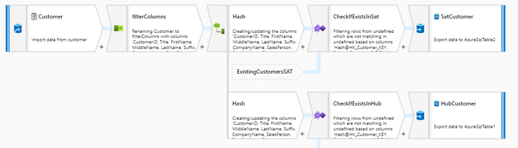 Azure Data Factory is a cloud based tool for data movement and transformations. A little more than a year ago a new feature, Data flows, was published which made it possible to do data manipulations and transformations without coding: User can drag and drop components into canvas to build processes to move and transform data. There are different kind of components available for manipulating data like filter, pivot, aggregate and lookup. It’s a pretty nifty tool for a lazy data engineer. Here’s a picture of a Data flow which loads customer data into a Data Vault 2.0 modeled data warehouse: