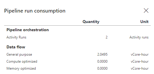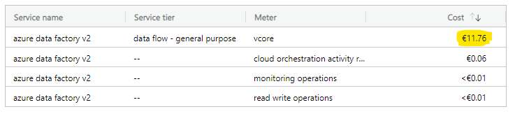 We can see that it took 2.0495 vCore hours to run. Where does this number come from? My runtime was a type of General purpose and had 8 cores in it. Total duration was 16 minutes which is about 0.2667 hours. And we had 8 cores so the total vCore-hours is 8 * 0.2667 which makes about 2.1. Quite close compared to 2.0495 shown above. There’s always some overhead in form of spinning up the cluster so actual run time of cluster is little less than total duration of pipeline. Price for this one run would be 2.0495 * 0.227€ which makes 0.47€.