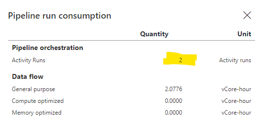 It has a row for Pipeline orchestration with an entry for Activity Runs and number two on it. Remember that in pipeline had two activities in it which both ran the same Data flow. That’s the reason for 2 activity runs. Pipeline was executed 25 times so number of activity runs is 25 * 2 = 50. Also all trigger executions must be added and there were 25 of those so the total number of activity runs in this case is 50 + 25 = 75. Now if we calculate the total amount, we will end up with figure 75/1000 * 0.844€ = 0.0633€. Once again close enough!