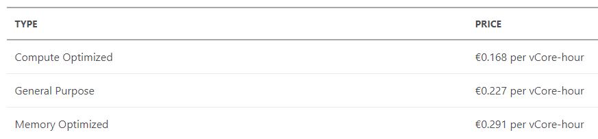 At the time of writing (January 2021), the prices for different compute types in West Europe region are:
