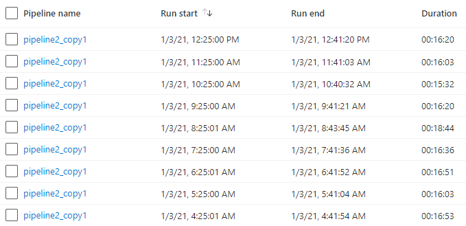 A trigger ran this pipeline once in an hour for one day. Here’s a screenshot of monitoring view which shows couple of those runs. Interesting part from billing perspective is Duration column which tells us that the pipeline took approx. 16 minutes to finish: