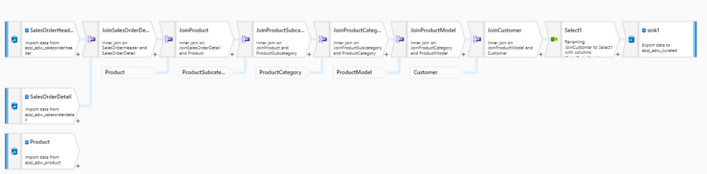 I’ve been toying with Azure Data Factory lately and especially with Data flows. It’s a graphical, low-code tool made for doing data transformations in cloud environment in a serverless manner. I got an idea of doing a little comparison between it and good old SQL from both performance and billing point of a view. My idea was to create a denormalized, a.k.a. wide table, by joining multiple tables together using both Data flows and SQL. I used AdventureWorks2019 sample database as a data source and combined 7 tables of sales related data and end result was like this: